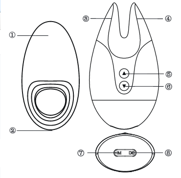 ① Punta vibratoria② cable de conexión de accesorios③ Punta vibratoria④ Punta vibratoria⑤ Accesorio Encender/Apagar/avanzar modo de vibración ⑦ conector de accesorios⑥ Fi Fi Encender/Apagar/avanzar modo de vibración⑧ Puerto de carga